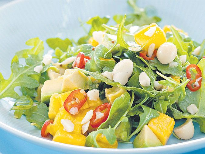 • Tiến hành trộn rau cải bó xôi, hạt macca, xoài và chút nước cốt chanh, dầu ô liu là có thể dùng.